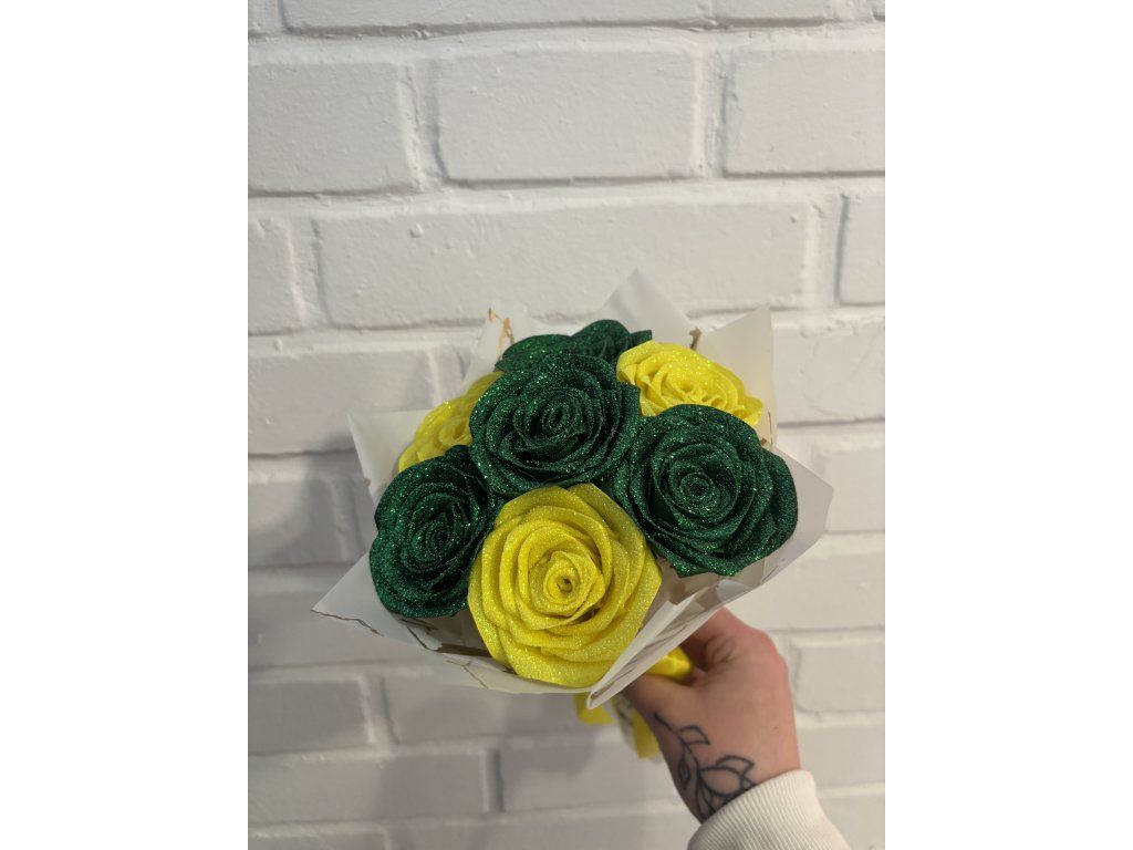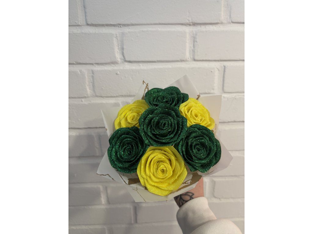 Rozjasněte den sobě nebo svým blízkým touto nepřehlédnutelnou kyticí z dílny Saténové kouzlo. Set obsahuje 7 ručně vyrobených růží v unikátní kombinaci sytě zelené a zářivě žluté barvy. Celý efekt podtrhuje bohaté zdobení třpytkami, které na světle vytváří kouzelné odlesky. Tento originální a trvalý dárek zaručeně vykouzlí úsměv a nikdy neuvadne.