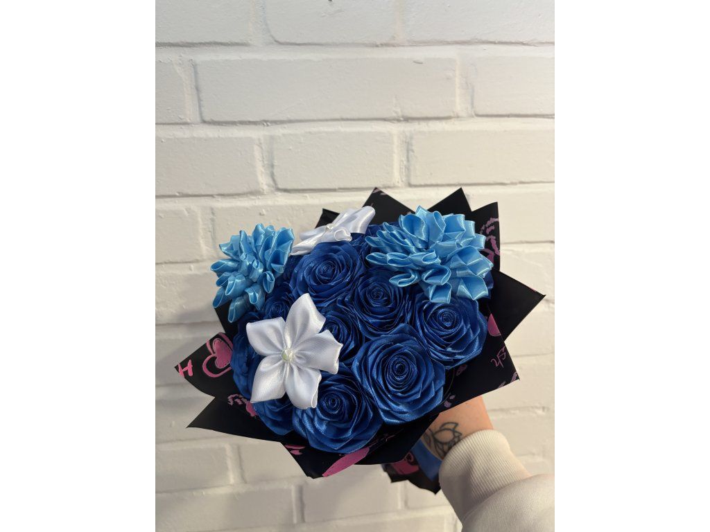 Aby kytice působila bohatě a rozmanitě, doplnili jsme ji o dvě světle modré jiřiny pro jemný kontrast a dvě sněhobílé plumerie zdobené perličkou uprostřed, které celému setu dodávají nádech exotiky a čistoty. Každý květ je pečlivě vyroben ze saténových stuh s vysokým leskem, což kytici dodává luxusní vzhled, který nikdy neuvadne.