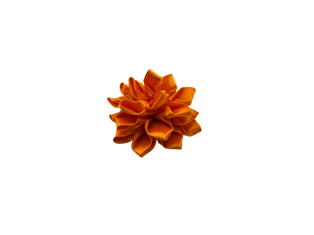 Ručně vyráběná jiřina ze saténové stuhy v jasně oranžové barvě. Lesklý satén podtrhuje zářivý odstín, který působí vesele, optimisticky a dodá každé dekoraci šmrnc.