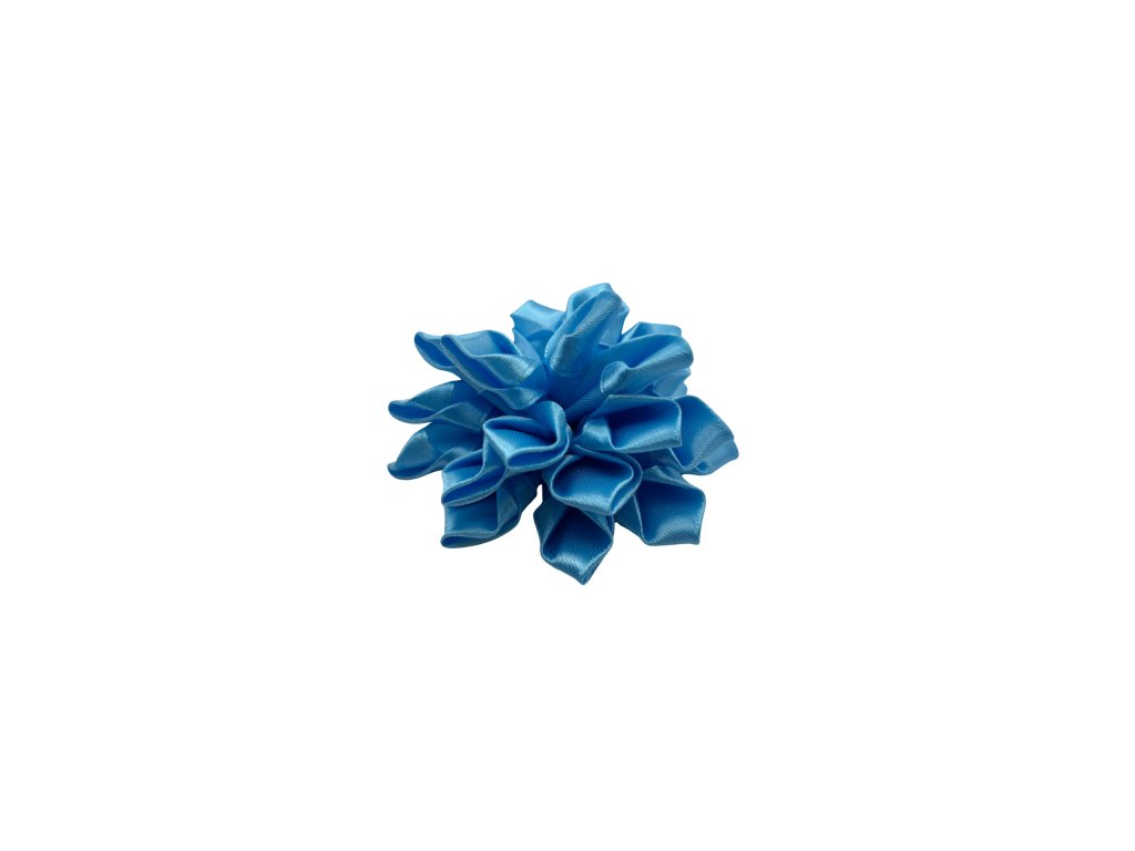 Nádherná ručně vyráběná jiřina ze saténové stuhy ve světle modré barvě. Lesklý satén dodává květu jemnost a svěžest, takže se skvěle hodí pro svatební i slavnostní dekorace.